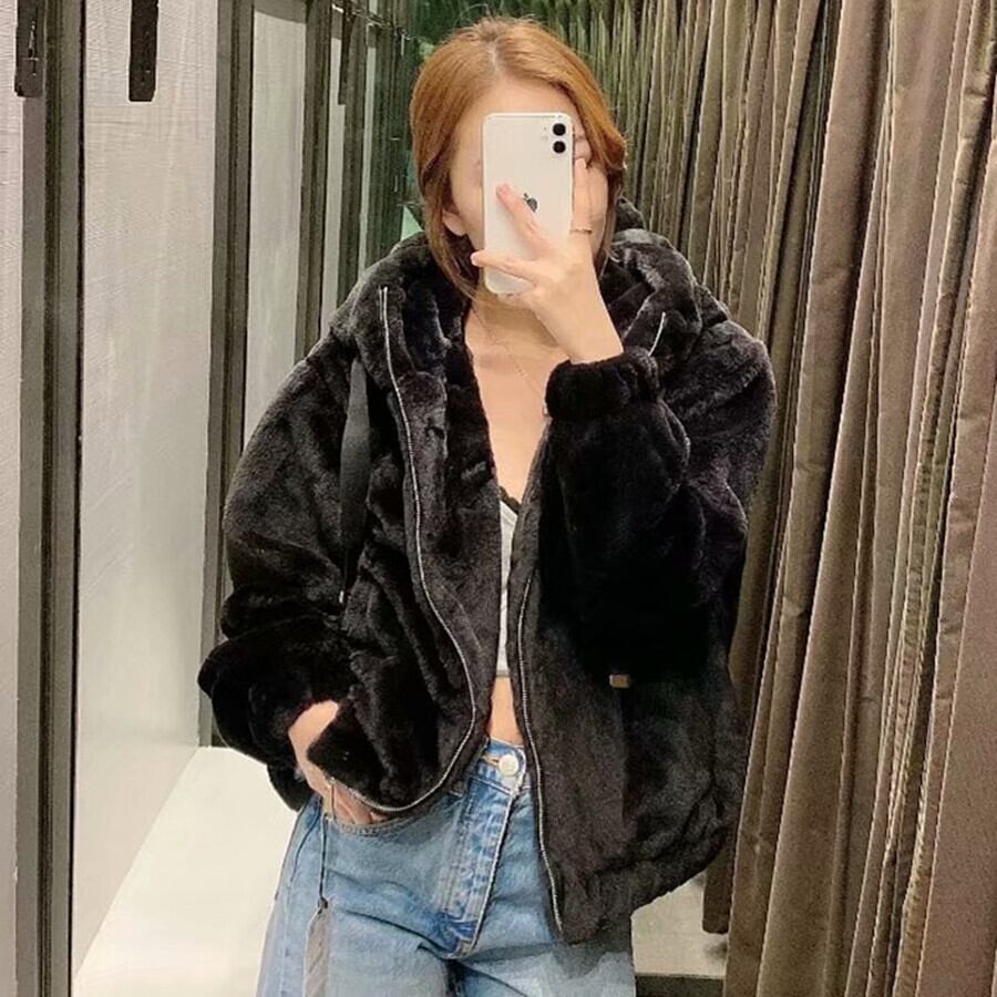 Ω ブラックショートフェイクファーフードジャケット Ω アイドル ジャケット ブルゾン Tシャツ 長袖 半袖 デニム ジーンズ スーツ ZARA フォーエバー21 GAP H&M WEGO HONEYS MUJI GU UNIQLO dholic babyGAP FOREVER21 Old Navy 春夏秋冬 韓国 K-POP Kpop 韓流 スター 25A12884499424
