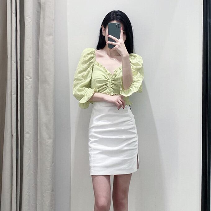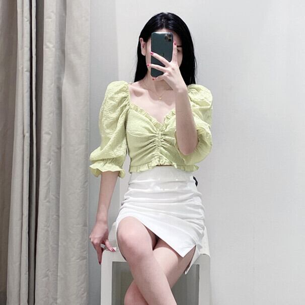 Ω クロップドショートブラウス グリーンスリーブVネック スクウェア Ω アイドル ジャケット ブルゾン Tシャツ 長袖 半袖 デニム ジーンズ スーツ ZARA フォーエバー21 GAP H&M WEGO HONEYS MUJI GU UNIQLO dholic babyGAP FOREVER21 Old Navy 春夏秋冬 韓国 K-POP Kpop 韓流 スター 25A956083779